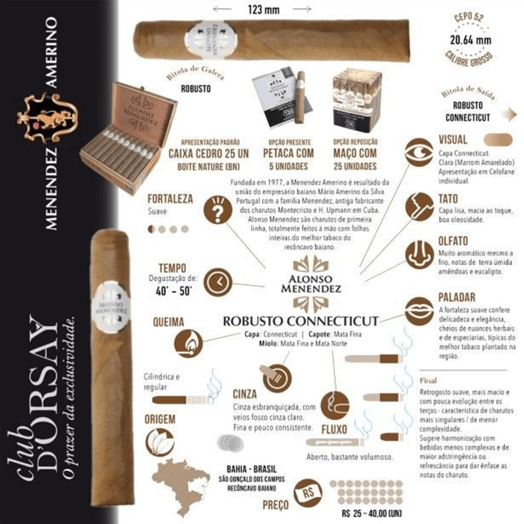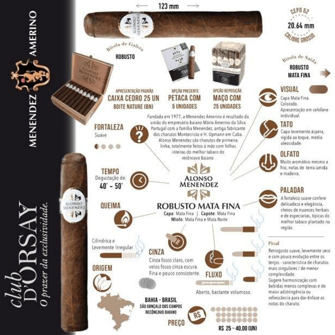 Alonso Menéndez cigars are premium, handmade cigars from Brazil that blend two main types of high-quality tobacco from the state of Bahia. Mata Fina tobacco, known for its mild aroma and sweet flavor, is often used for the cigar’s wrapper. Mata Norte tobacco, which has a stronger scent and a richer flavor, is used in the blend to create a mild to medium strength cigar. The resulting cigars are characterized by their smooth draw and prominent notes of cocoa, hazelnut, and caramel, with subtle hints of herbs and spices.